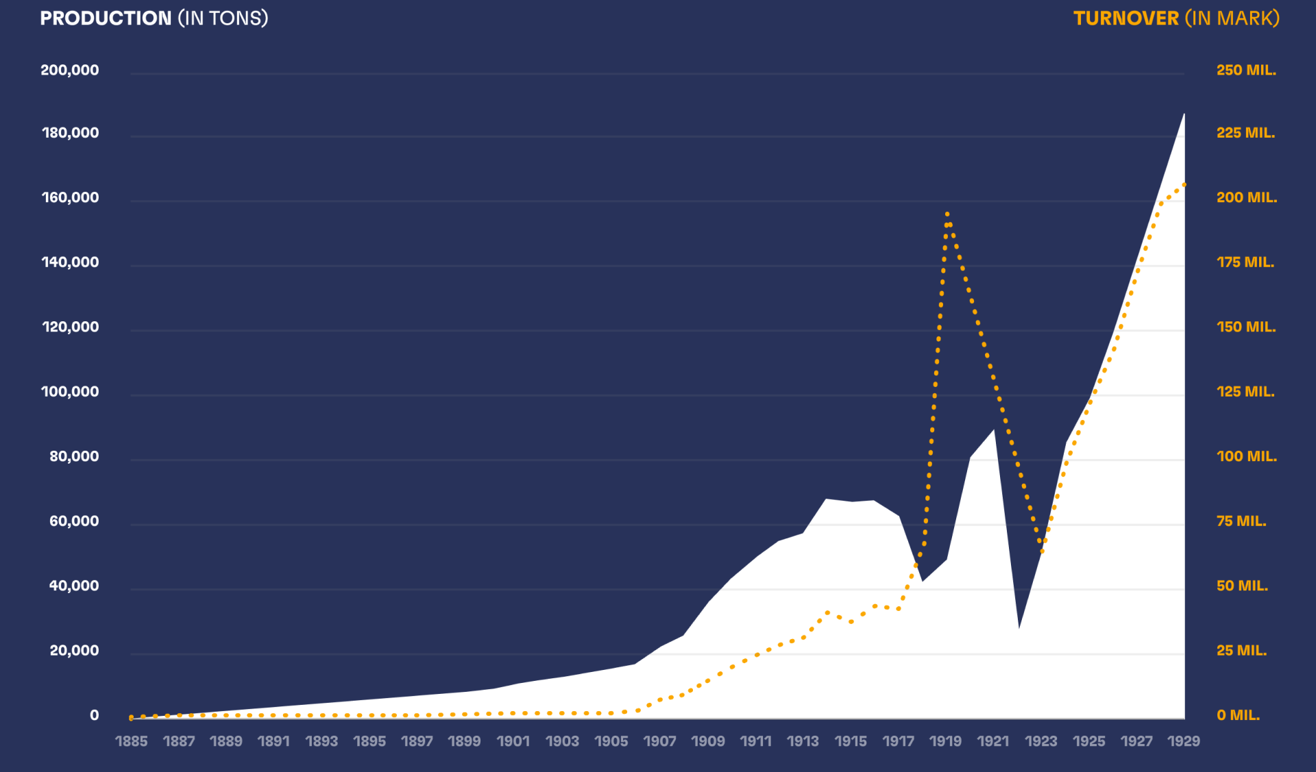 Unfortunately, very few company statistics of the early years still exist today. The first sales report that survived covers the year 1884, when the company generated 239,000 marks. The production volume was not systematically tracked before 1900. What is known is that up until the outbreak of World War I, production and sales volumes rose steadily. During the war, there was an initial slump due to the general economic situation and the shortage of raw materials – it was not until 1920 that it got back close to pre-war production levels. The second turning point followed after the end of the war: The devaluation of the mark was in full swing and escalated to hyperinflation in 1923. For this reason, no reliable figures are available for these years.